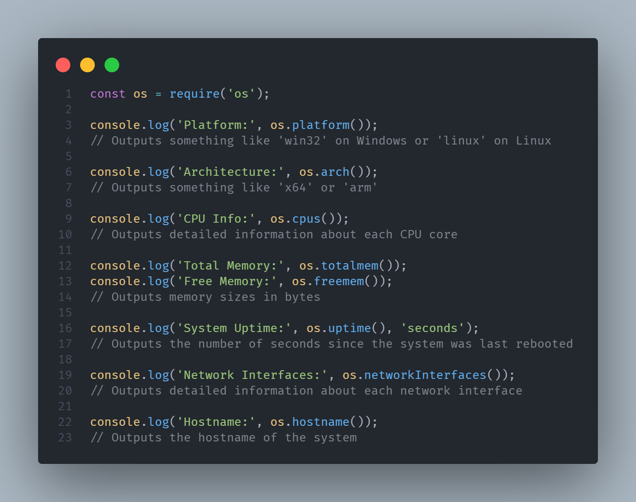Cross-Platform Compatibility : By using methods like os.platform() and os.arch(), you can write code that behaves differently depending on the operating system and architecture.