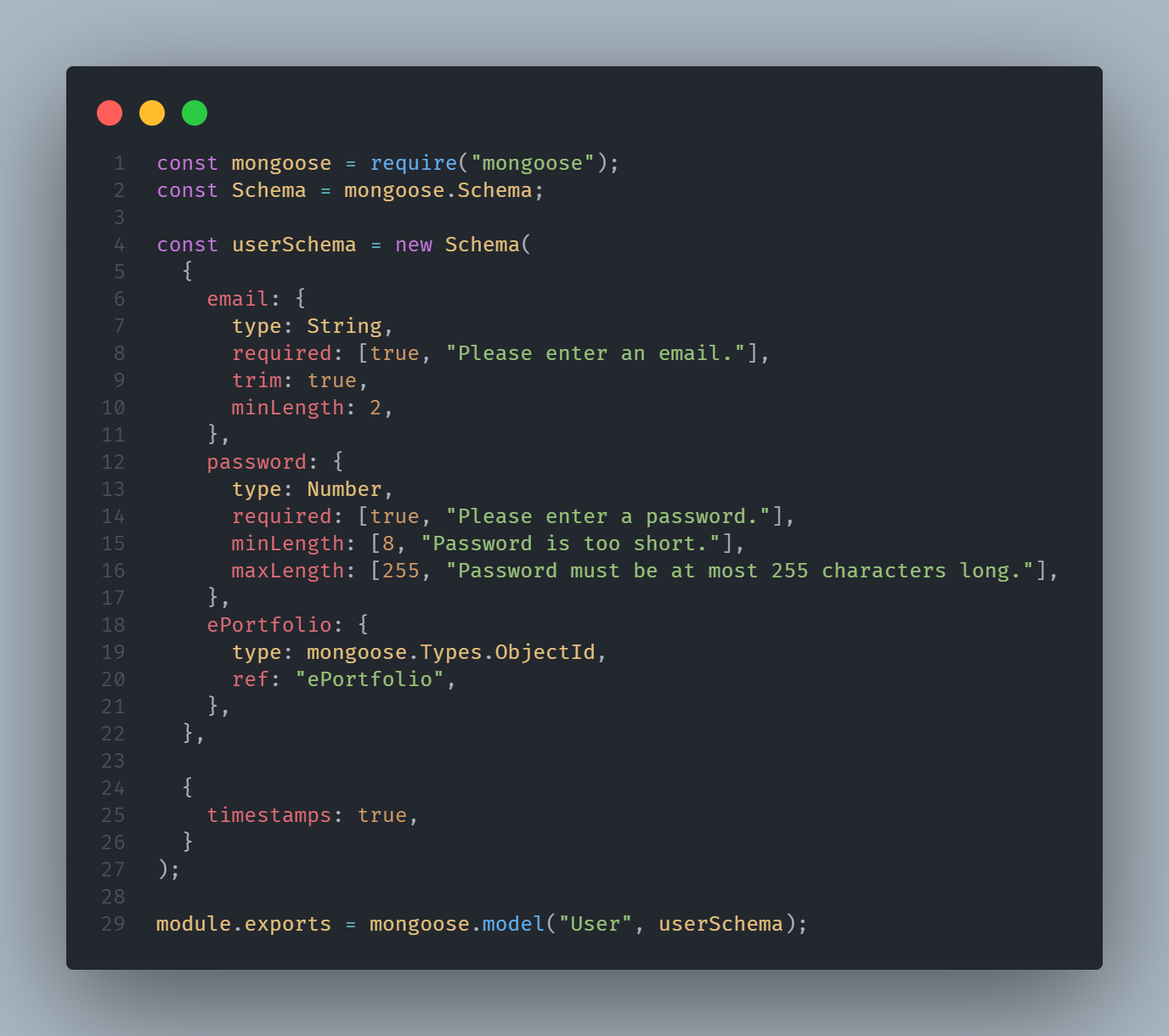 The Model is responsible for data handling and interacting with the database (MongoDB, etc.). This is where all database schemas are constructed and CRUD operations are handled using a library like Mongoose.
