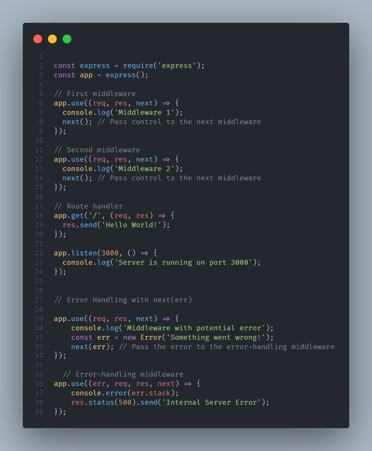 You can also pass an error to next() by calling it with an argument, like next(err). This tells Express to skip all remaining non-error-handling middleware and pass the error to the error-handling middleware.