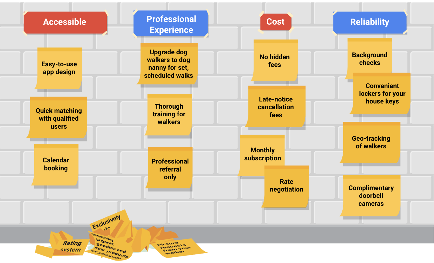 a wall covered in sticky notes of various features. Easy-to-use app design, complimentary doorbell cameras, no hidden fees, quick matching with qualified users, calendar blocking, monthly subscription, background checks, convenient lockers for your house keys, late-notice cancellation fees, rating system, professional referral only, rate negotiation,.