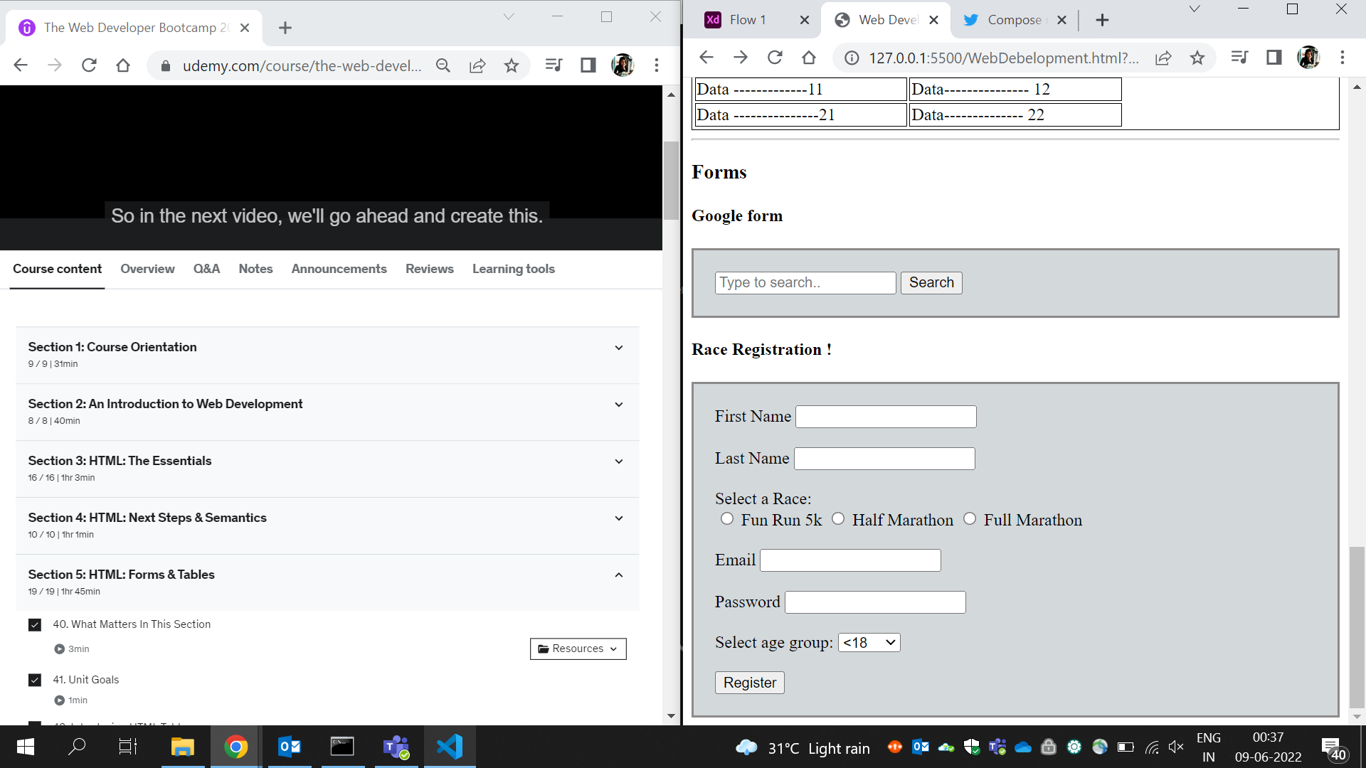 Completed the last section of HTML, it included Forms, different input types and validation.