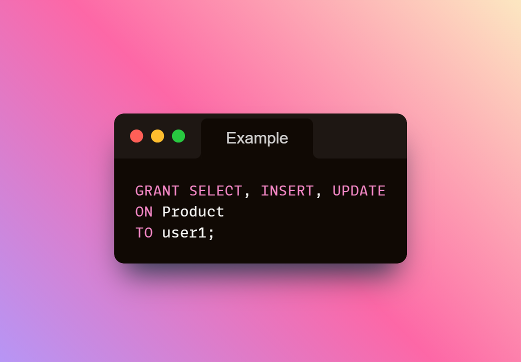 Imagine we want to allow a user named user1 to read, insert, and update records in a Product table. We can use the following GRANT statement: