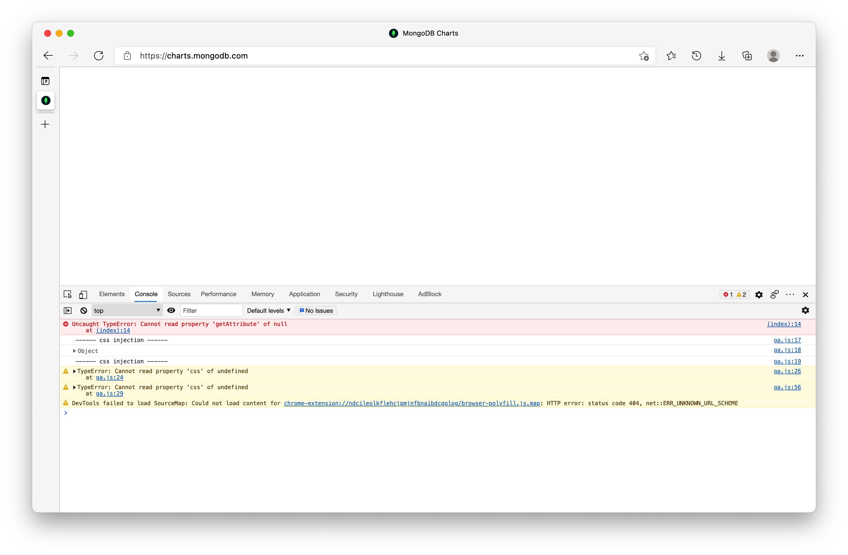 both the main page of MongoDB Charts and the Charts that have been created do not work and everything appears blank due to a very simple javascript error