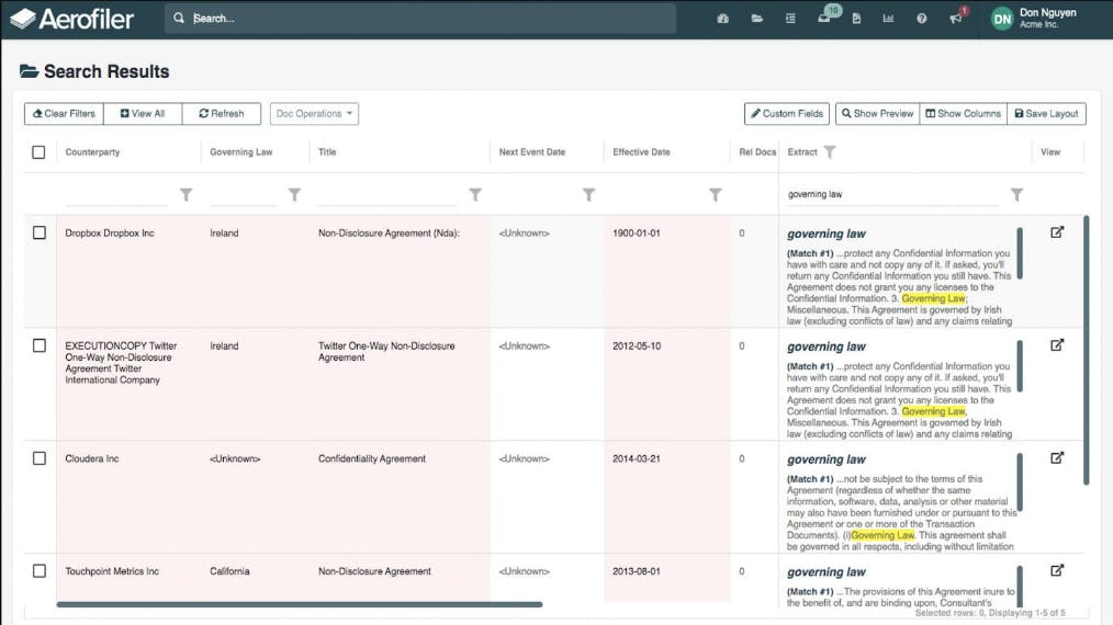 Don says the difficulty with running AI to extract data is you can't usually see where the data is coming from, and you can't train your models, for example, to extract a concept that might be specific to your industry. Aerofiler supports custom extraction so firms can crawl for and find exactly the results they're looking for, and it highlights exactly where in the contract the data is found.