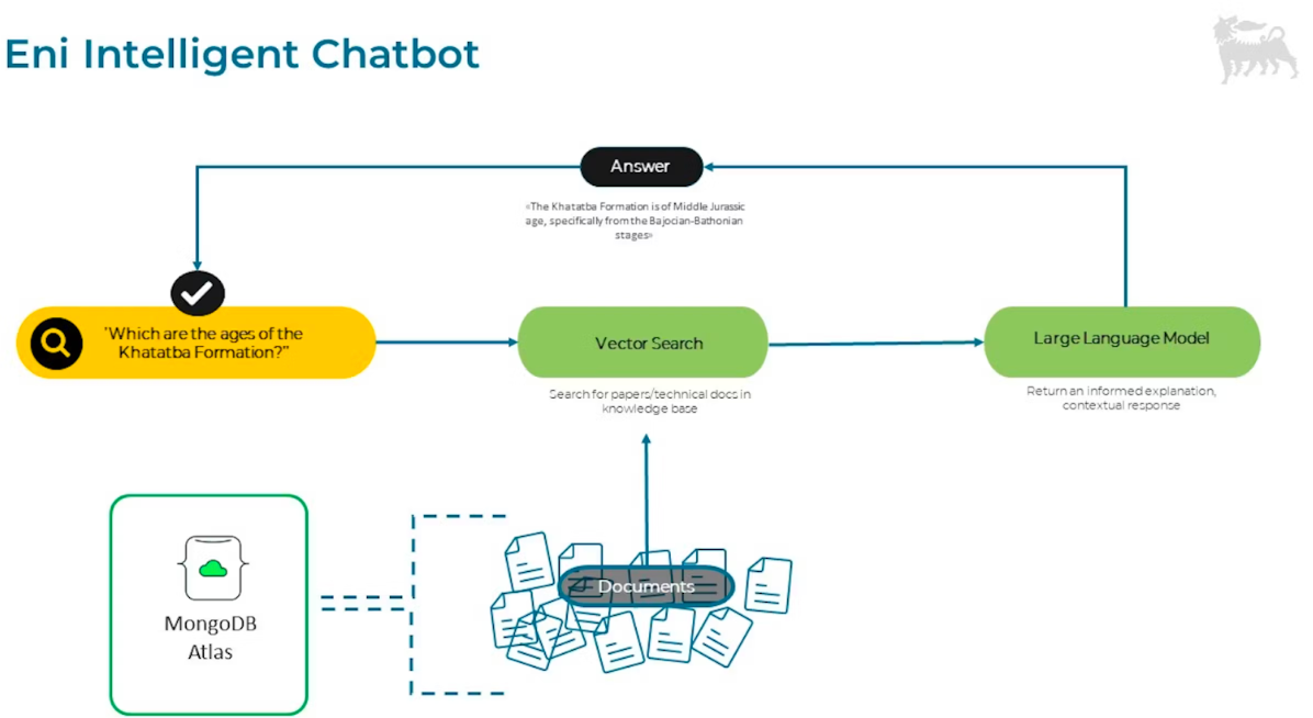 With MongoDB Atlas, Eni users can quickly find data spanning multiple years and geographies to identify trends and analyze models that support decision-making within their fields. The platform uses MongoDB Atlas Search to filter out irrelevant documents while also integrating AI and machine learning models, such as vector search, to make it even easier to identify patterns.