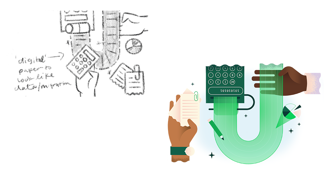 Because I’ve joined the team, we’re able to have fuller discussions about illustration. Our designers work in a fast-paced world, but my process is slower because I make more bespoke illustrations and have to talk to people to understand the technicalities so we can go beyond generic illustrations. I have to be more thoughtful of what we’re presenting to the audience. Even though by having these conversations I slow down how quickly the designers move, I'm striving to build stronger relationships on the team through this practice.