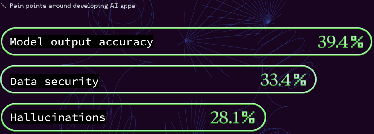 As per the recent State of AI, 2023 report by Retool, data security and data accuracy are the top two pain points when developing AI applications. In the survey, a third of respondents cited data security as a primary pain point, and it increases almost linearly with company size (refer to the MongoDB blog for more details.)