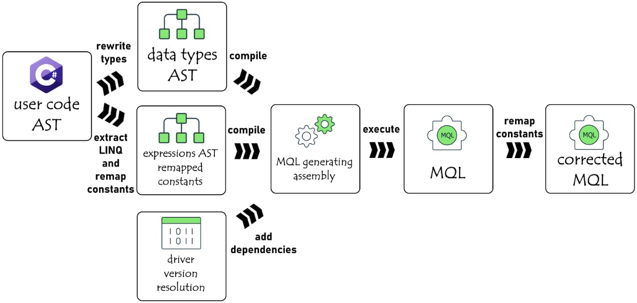 The .NET.C# driver provides an API to render any LINQ or Builder expression to MQL. The next logical step is to identify the needed expressions and use the driver to extract the matching MQLs. Extracting the Builders or LINQ expression syntax nodes from the syntax tree provided by Roslyn was fairly straightforward.