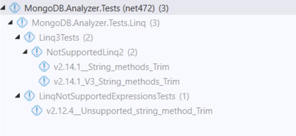 For example, for LINQ expression .Where(u => u.Name.Trim() == "123"), we expect the Analyzer to produce a warning for LINQ2 and valid MQL for LINQ3. The test case is written in the following way: