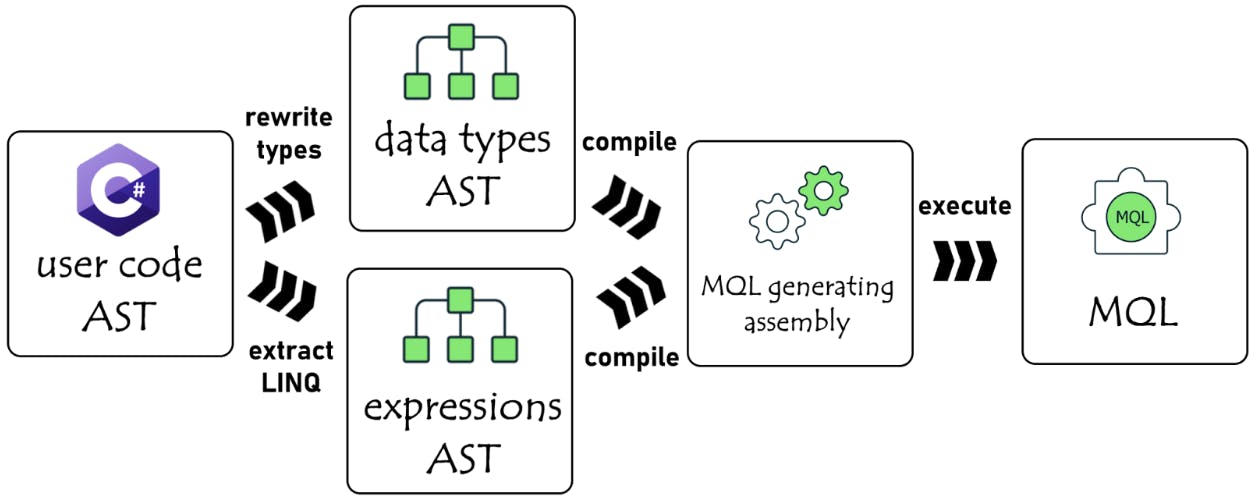 Given that MQL generation from a C# expression is basically transpiling, we knew that theoretically inferring the general form of MQL in compile time was solvable by static analysis. This realization, and the fact that the .NET ecosystem has an amazing framework for writing static analyzers (Roslyn), made me excited to try out this idea during MongoDB Skunkworks week.