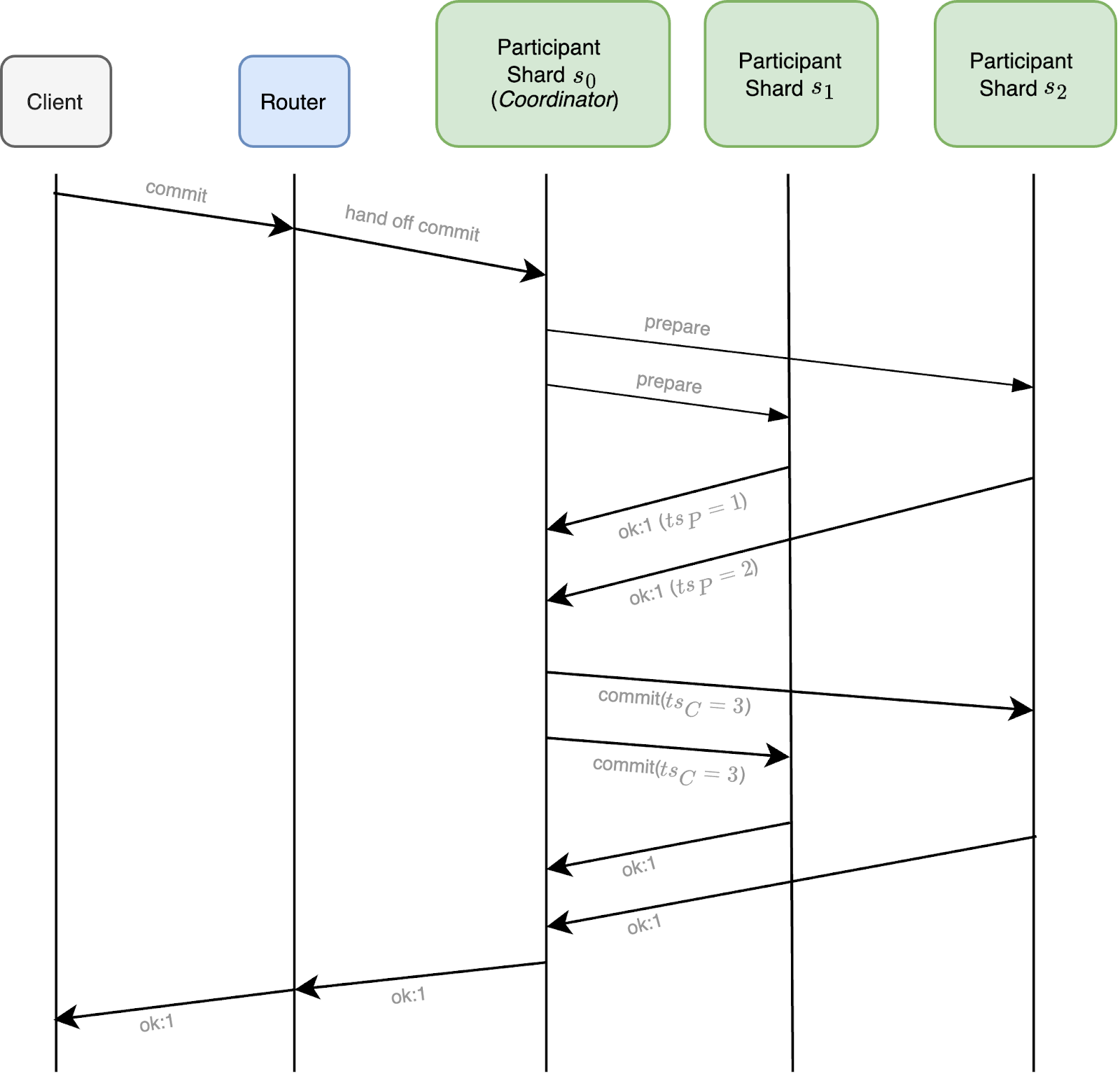 Figure 2. Basic commit flow of multi-shard distributed transaction, with associated timestamps.