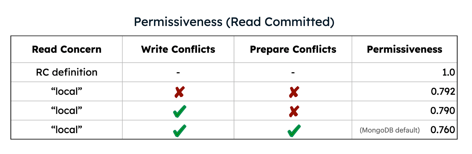 For example, at MongoDB’s readConcern: “local” isolation level, we can compare its permissiveness level to a general read-committed definition, for finite protocol parameters. In particular, we can analyze permissiveness when weakening various storage engine concurrency control conditions, including prepare-conflict blocking (as discussed above) and/or write-conflict checking. Measuring permissiveness in these scenarios gives us a quantitative way to understand a protocol and guide it toward a theoretical optimal permissiveness level for a given isolation guarantee.