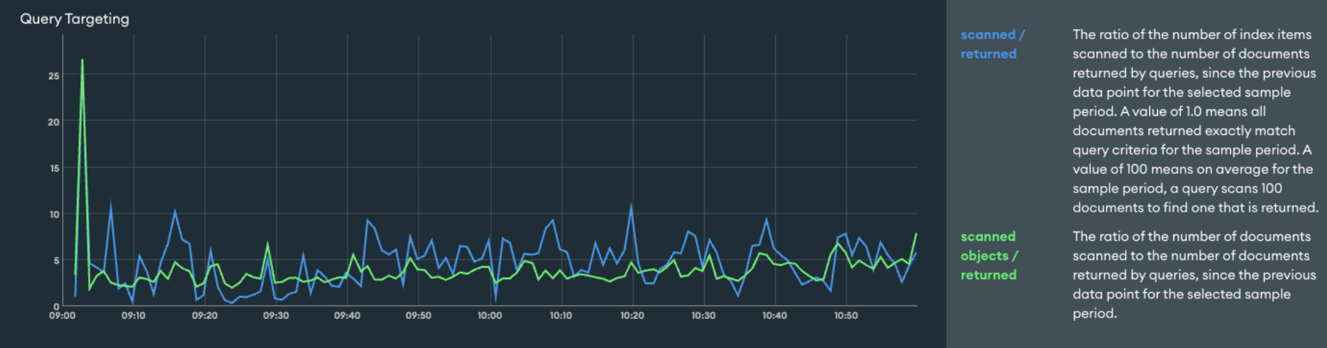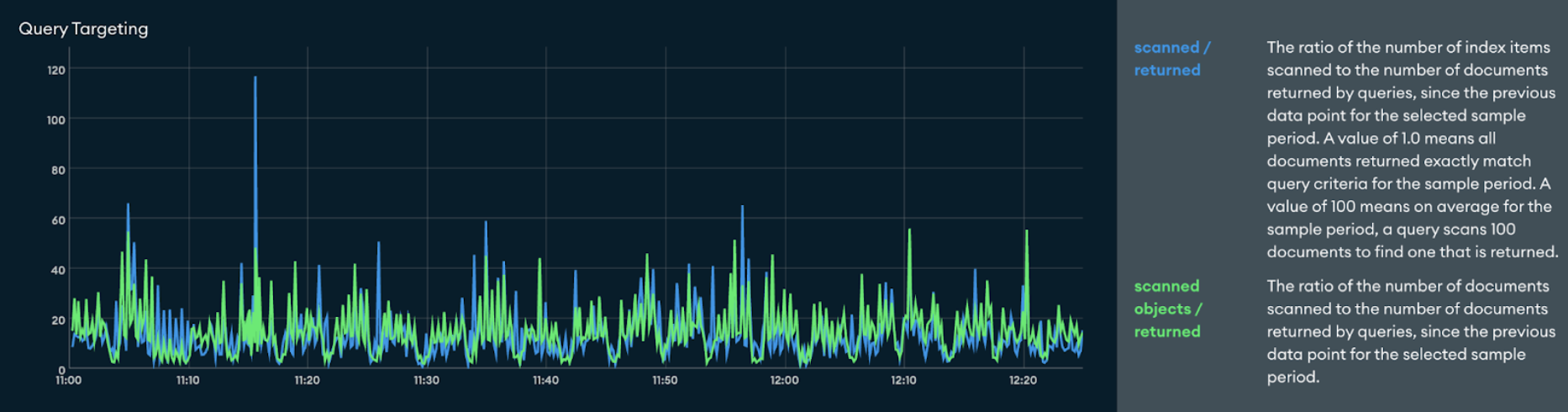 This represented roughly a 5x increase in the rate per second of index keys and documents scanned by queries and query plans.