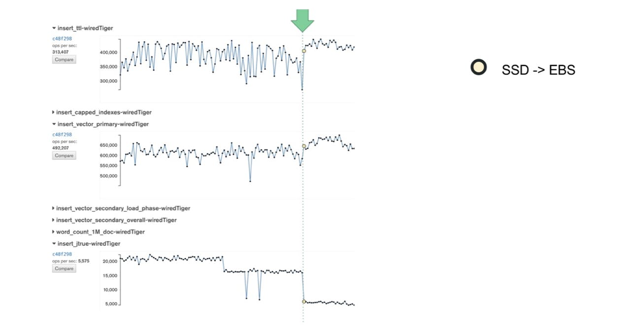 After running with the changes for a couple of weeks, you could clearly see how the day-to-day variation of test results decreased dramatically. This instantly made the entire System Performance project more useful to the development team and MongoDB as a whole.