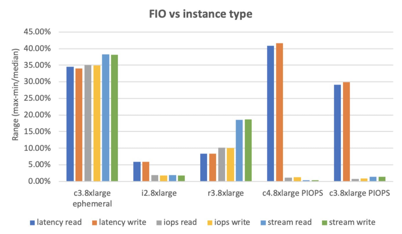 Contrary to popular belief, when using Provisioned IOPS with EBS, the performance is both good in absolute terms, and very very stable! This is true for our IO tests and our general tests. The latency of disk requests does have more variability than the SSD alternatives, but the IOPS performance was super stable. For most of our tests, the latter is the important characteristic.