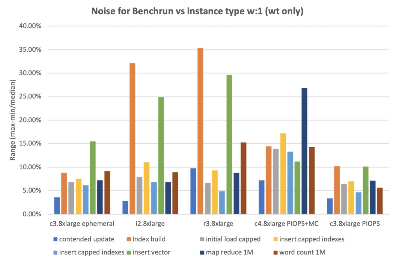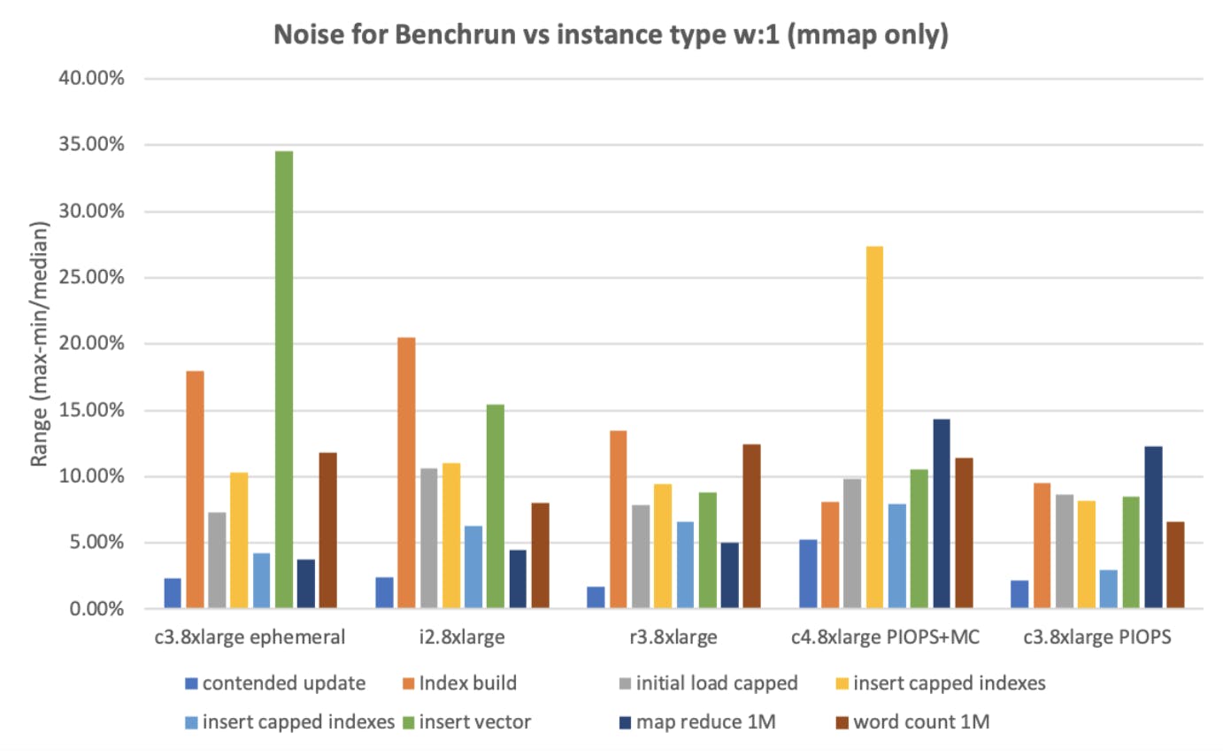 We look first at the IO specific results, and then our general MongoDB benchmarks. In the below graph, we are graphing the "noise" metric as a percentage computed from (max-min)/median and lower is better. c3.8xlarge with ephemeral storage is our baseline configuration which we were using in our production environment.