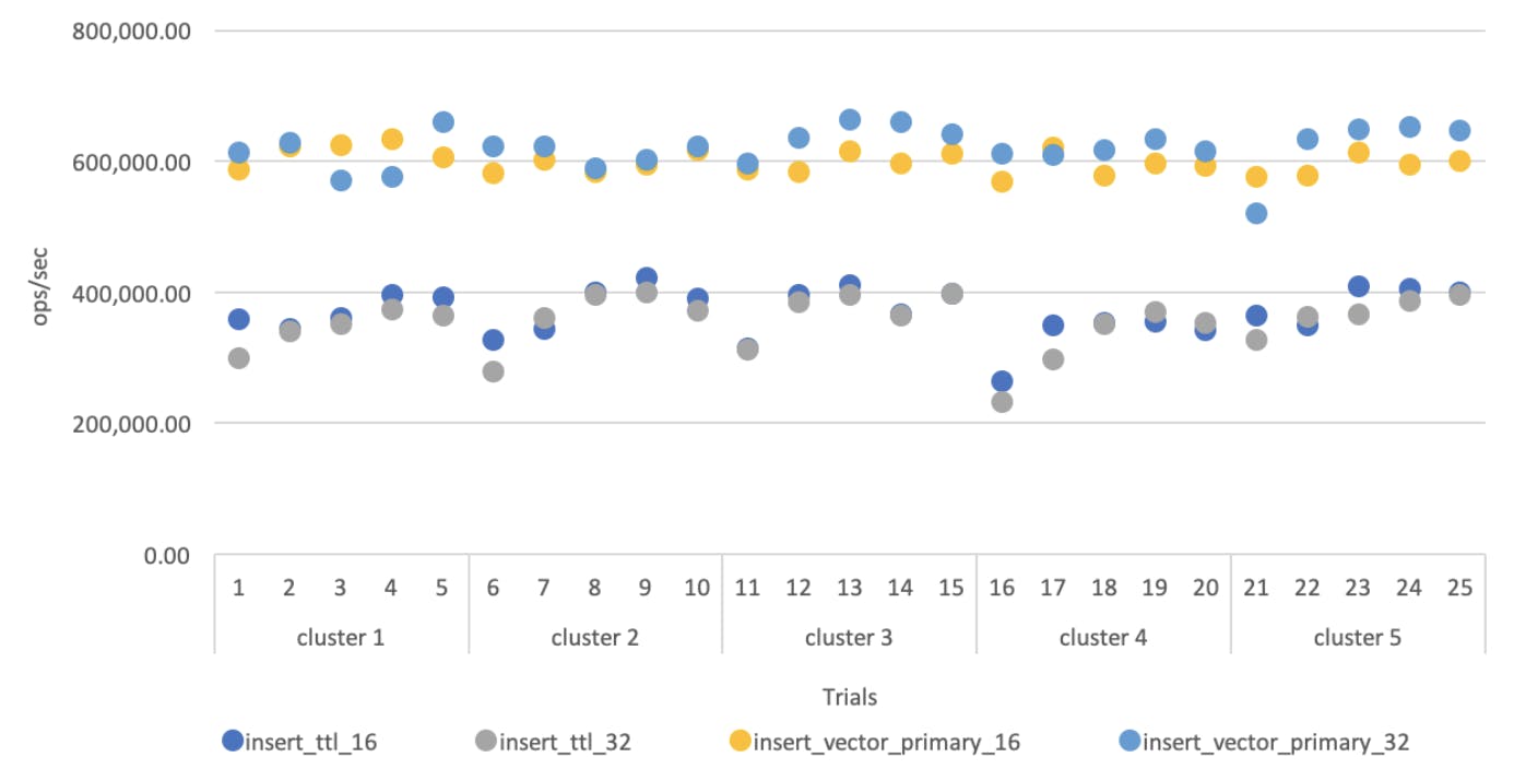 Our first experiment created a lot of data that we sifted through with many graphs. We started with graphs of simple statistics from repeated experiments: the minimum, median, and maximum result for each of our existing tests. The graphs allowed us to concisely see the range of variation per test, and which tests were noisy. Here is a representative graph for batched insert tests: