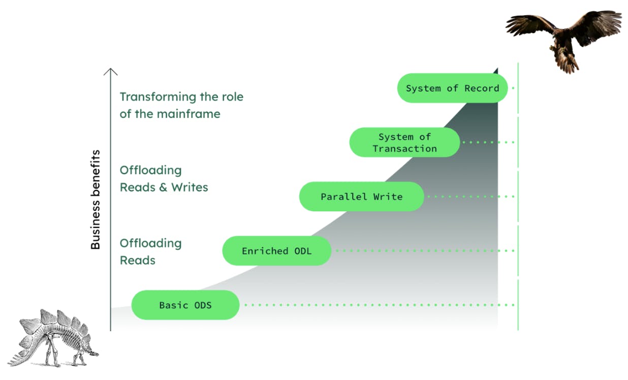 Implementing an ODS requires a thoughtful approach that aligns with the organization's digital transformation journey. Typically, the adoption path consists of several stages as seen in Figure 3. Initially, organizations focus on extracting data from one system into their Operational Data Store, allowing them to operate on a more unified dataset. Gradually, they can retire legacy systems and eliminate the need for intermediate data streams. The key benefit of this incremental approach is that it delivers value (e.g. offloading mainframe operations) to the business at every step by eliminating the need for a complete overhaul and minimizing disruption.