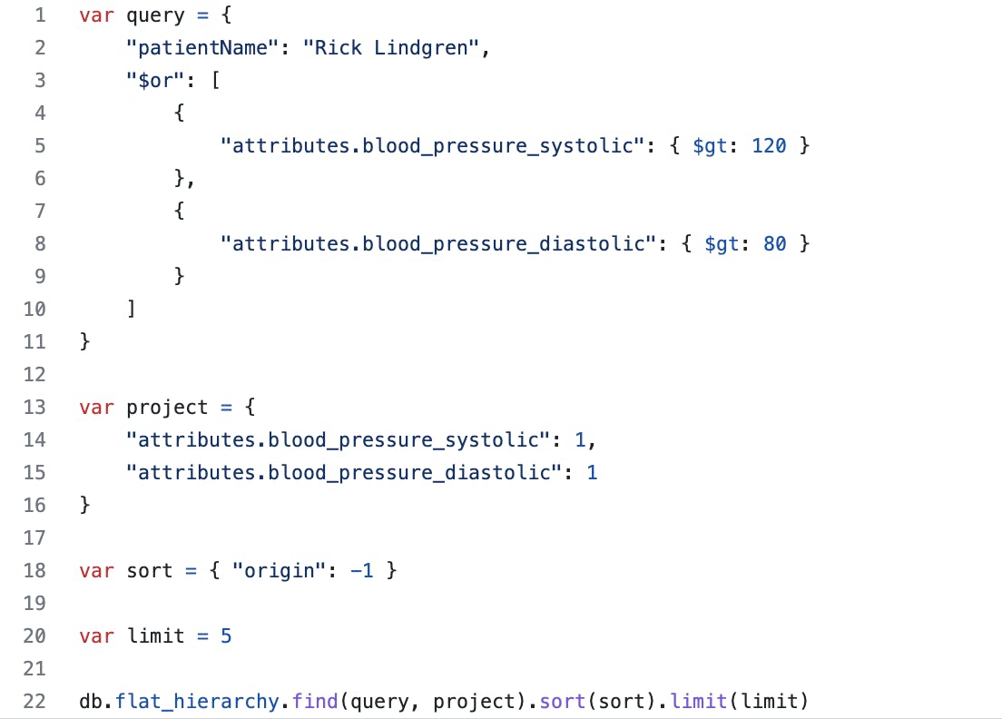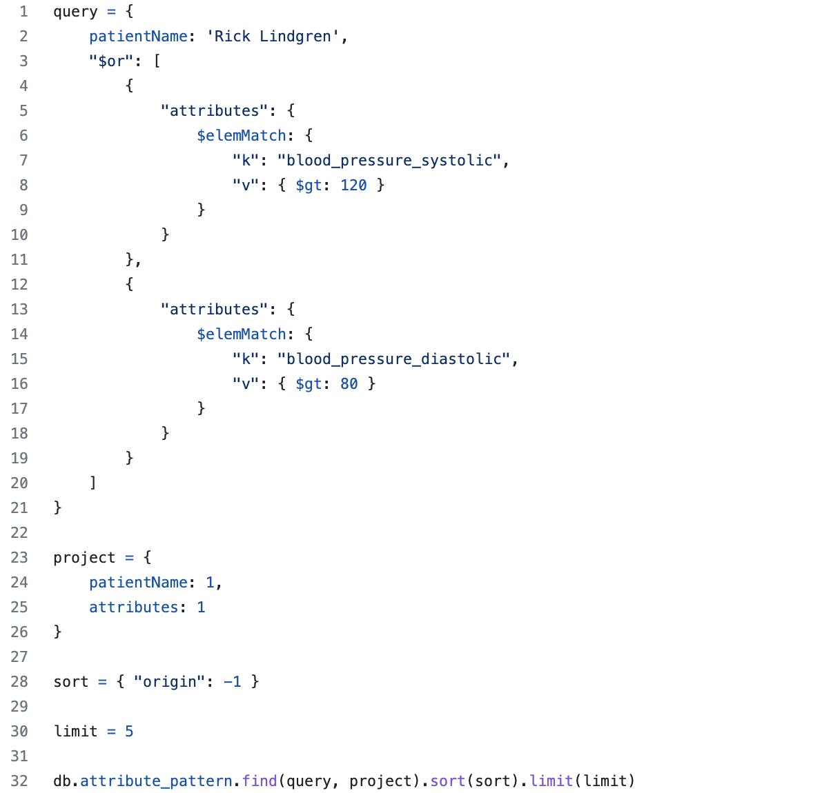 The query for our example scenario to “get the latest 5 abnormal blood pressure values that were recorded in a health encounter for a specific patient” can be simplified as follows.