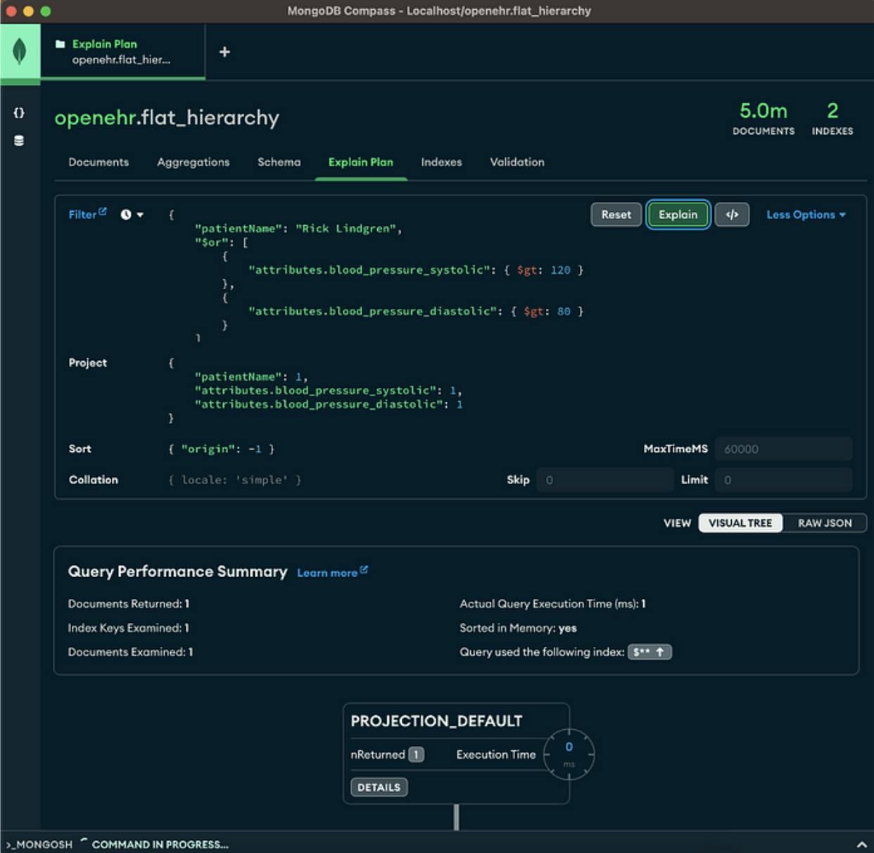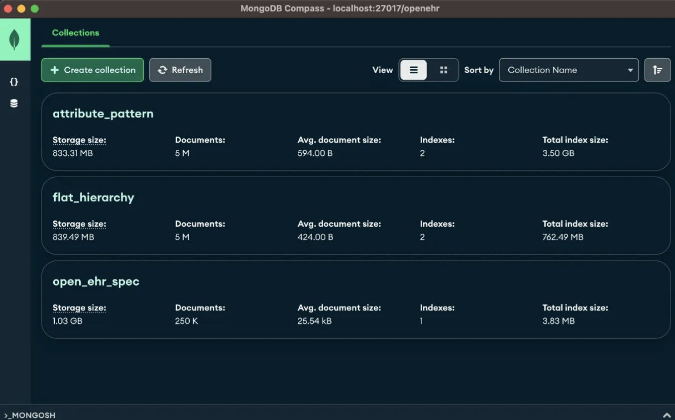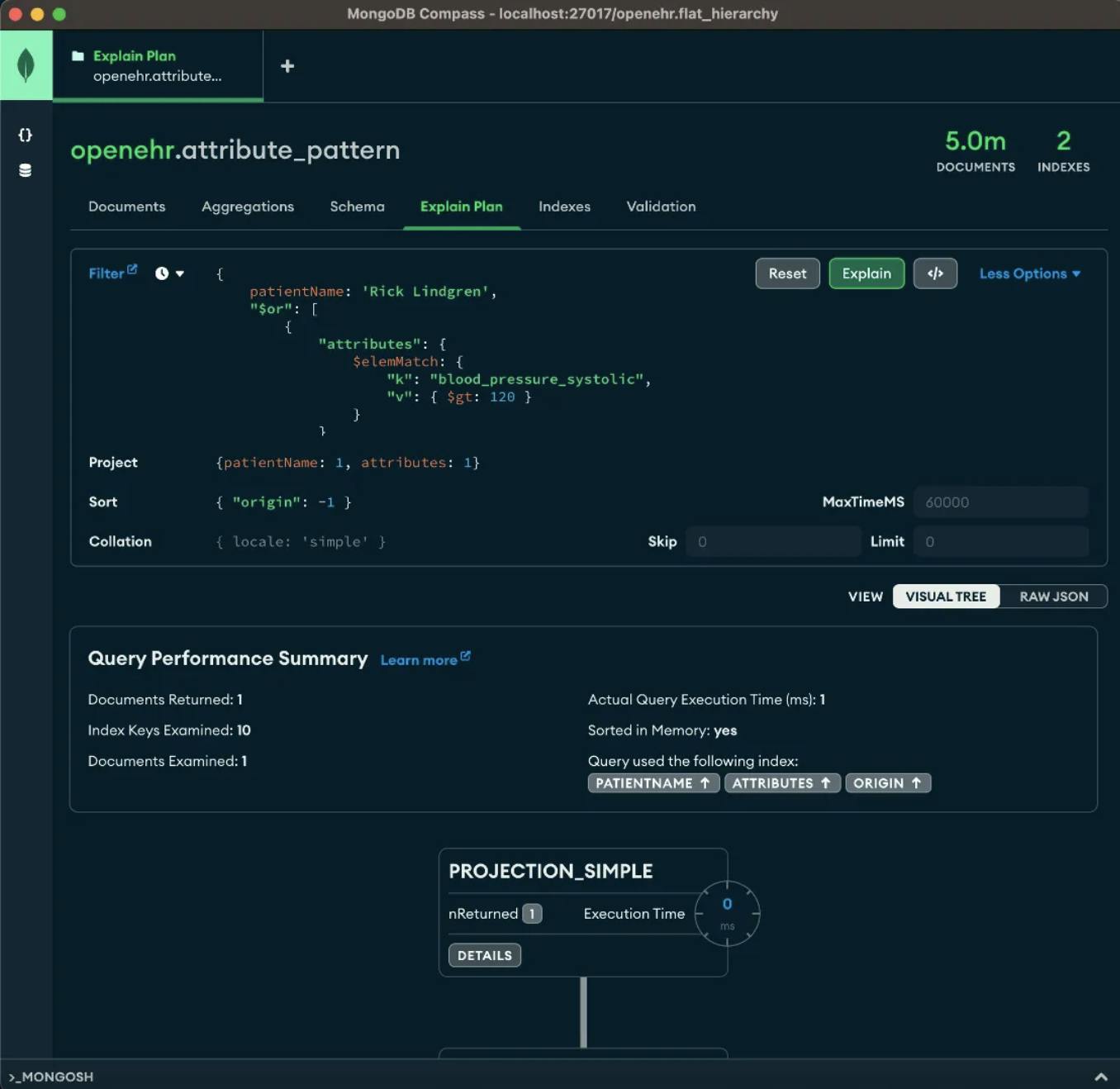 When comparing the storage size to openEHR standard spec, the flat hierarchy spec model only takes 839 MB compressed storage for 5 MM documents.