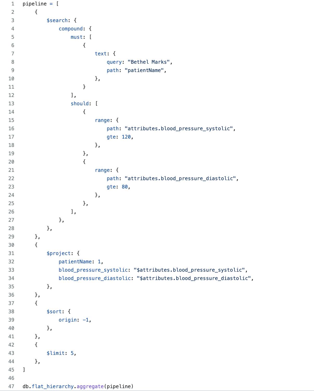 Atlas takes care of the various steps leading up to making a Lucene search index available. Once the index is in place, you can query using $search opearator. The query we have seen in above solution options can be constructed as follows.