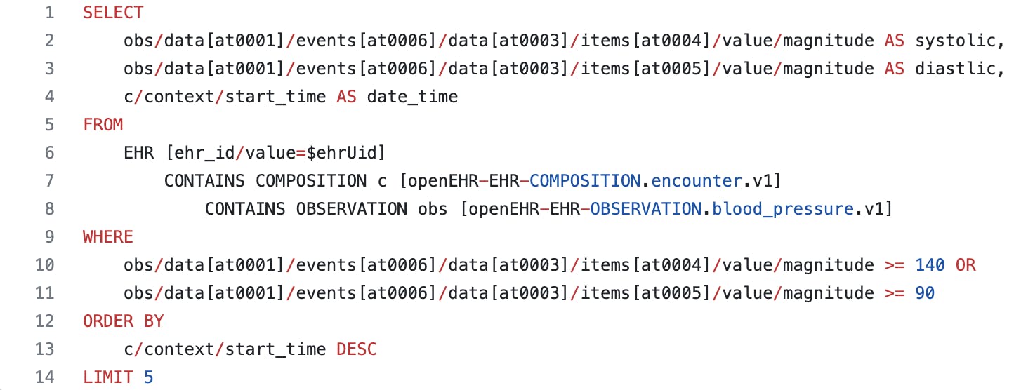 Archetype Query Language (AQL) is a query language specifically designed for querying clinical data stored in openEHR-based electronic health record systems. It provides a standardized and powerful way to retrieve specific clinical information from structured data using archetypes and templates. AQL enables clinicians, researchers, and developers to express complex queries, filter data based on clinical criteria, and retrieve meaningful information for analysis and decision support. For example to “get the latest 5 abnormal blood pressure values that were recorded in a health encounter for a specific patient”, you can write an AQL as follows: