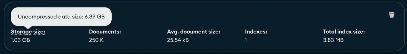 Additionally, the storage is significantly improved taking 833 MB compressed storage space for 5 MM documents, as well as efficient retrieval using index.