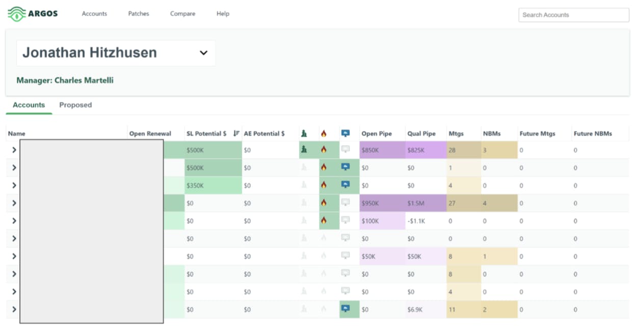 The solution, named Argos, is a web application built on top of MongoDB Atlas. Launched in early 2021, it is now being used by more than 600 people in MongoDB’s sales teams. Argos helps employees to understand the potential spend for each of their accounts, which in turn informs account and territory planning at the regional, team, and rep level.