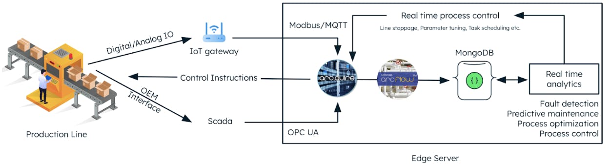 Arcstone understands that extracting data from legacy equipment is a challenging task. Therefore, they have created a low-code solution named arc.quire to handle the collection of raw data and streaming into a database for storage. arc.quire is used in tandem with a process orchestration tool called arc.flow to establish connectivity between arc.quire and the database, for example, MongoDB EA.