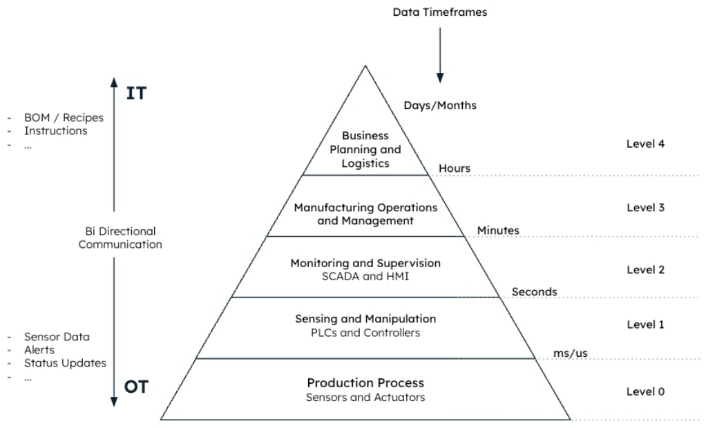 The automated pyramid does not easily scale to handle this increased volume of data and devices, leading to potential bottlenecks and inefficiencies in the manufacturing process. For example, if a new machine is added to the production line, ISA-95 requires significant changes to the factory IT and OT architecture, which can be time-consuming and costly.
