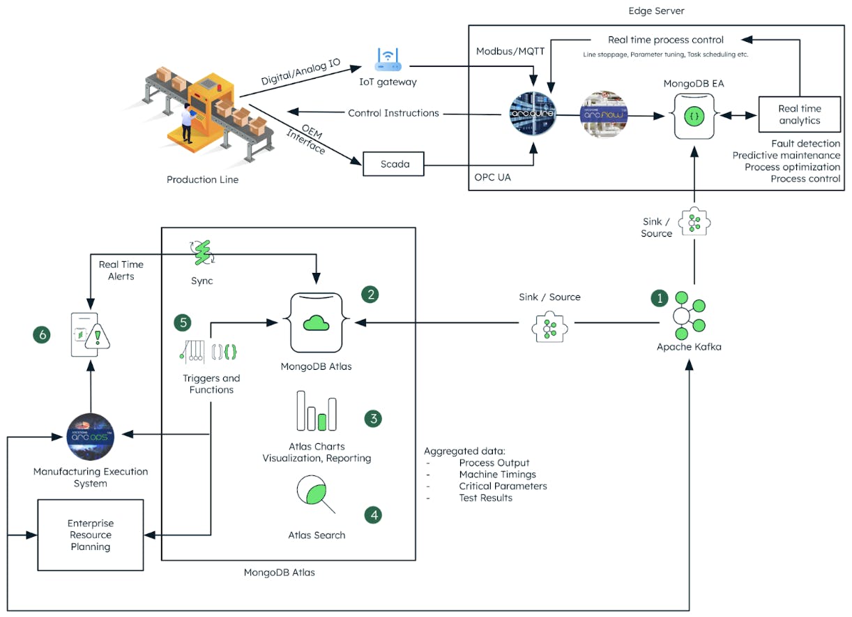 In this architecture, arc.ops MES, ERP, and edge server publish data to the message stream in Apache Kafka where the event queue makes the data available for MongoDB Atlas to consume via Kafka connectors [1 and 2]. Depending on the factory requirements around batch processing and scalability, Kafka can be replaced by a MQTT broker. There are multiple community backed and commercial libraries to push MQTT data into MongoDB.