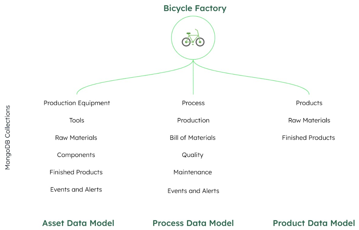 Let us take an example of a bicycle factory and look at example asset, process and product-centric data models. At a minimum, the following collections (Figure 3) will need to be created in the database.