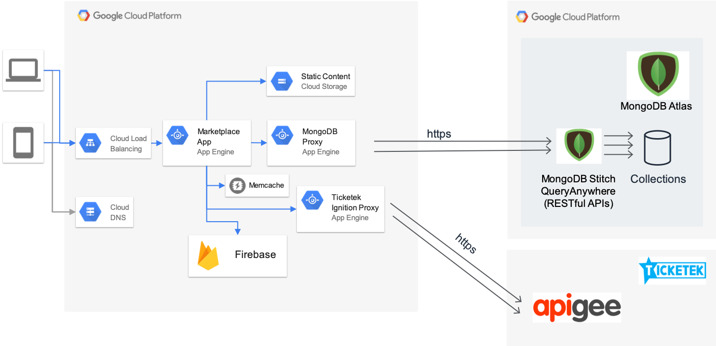 Ticketek today has multiple MongoDB clusters in MongoDB Atlas, in various regions across the AWS and GCP public clouds, powering the full Ticketek platform. For Ticketek Marketplace, the dedicated MongoDB cluster in MongoDB Atlas is deployed in the GCP Sydney region following MongoDB’s high availability best practice utilising MongoDB Stitch Functions to provide Query Anywhere access to the databases and collections. Query Anywhere allows us to easily request information that’s stored in Atlas directly from our front-end application code. Our developers are able to access all the features and scalability of the MongoDB database while securely coordinating between services, the data, and clients.