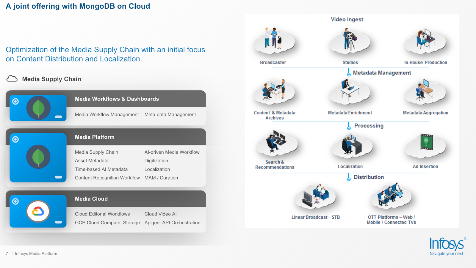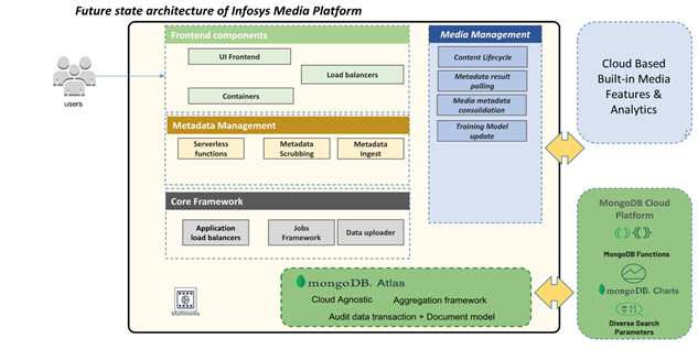 Infosys’ intelligently-woven media and metadata management framework, leveraging MongoDB’s document model, enables smart workflows and incorporates ML/AI to create, manage and moderate content metadata. This allows the orchestration workflows across different business functions. Additionally, the platform delivers the benefits of productivity, scalability, and agility via the cloud and streamlines collaboration among the ecosystem of partners and technology solutions.