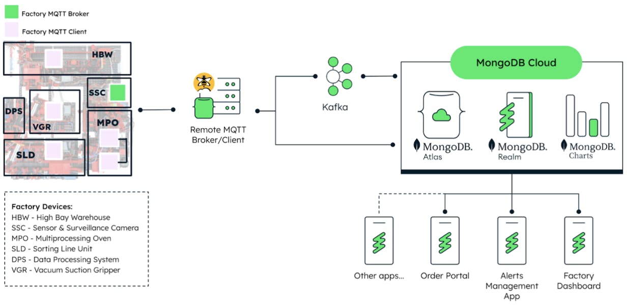 It is important to remember that the method of making this connection between the devices and MongoDB depends on the communication protocols the device is equipped with. On the shop floor, multiple protocols are used for device communication, such as MQTT and OPC-UA, which may require different connector technologies, such as Kafka, among other off-the-shelf IoT connectors.