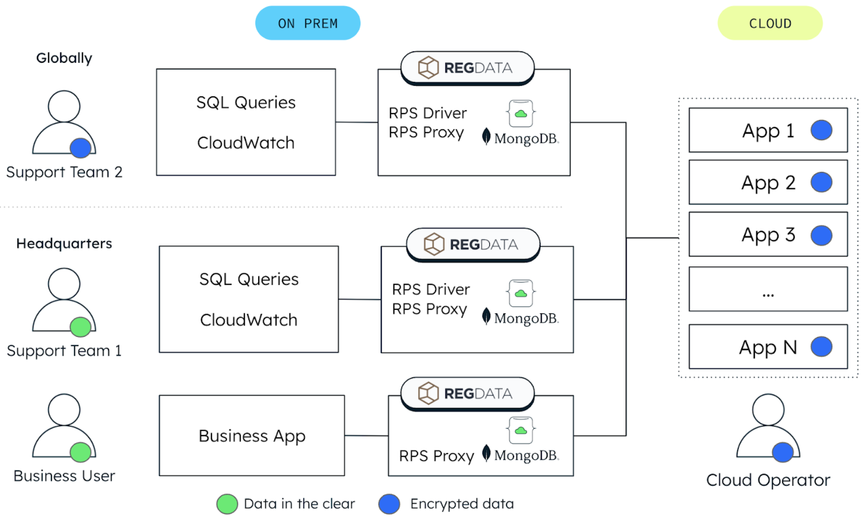 The illustration below shows the architecture of a private bank utilizing RPS. Data can only be seen in plain text to database admins when the request comes from the company’s headquarters. This ensures compliance with regulations, while still being able to query and search for data outside the headquarters. This bank goes a step further by migrating their Customer Relationship Management (CRM), core banking, Portfolio Management System (PMS), customer reporting, advisory, tax reporting, and other digital apps into the public cloud. This is achieved while still being compliant and able to automatically generate submittable audit reports to regulating authorities.
