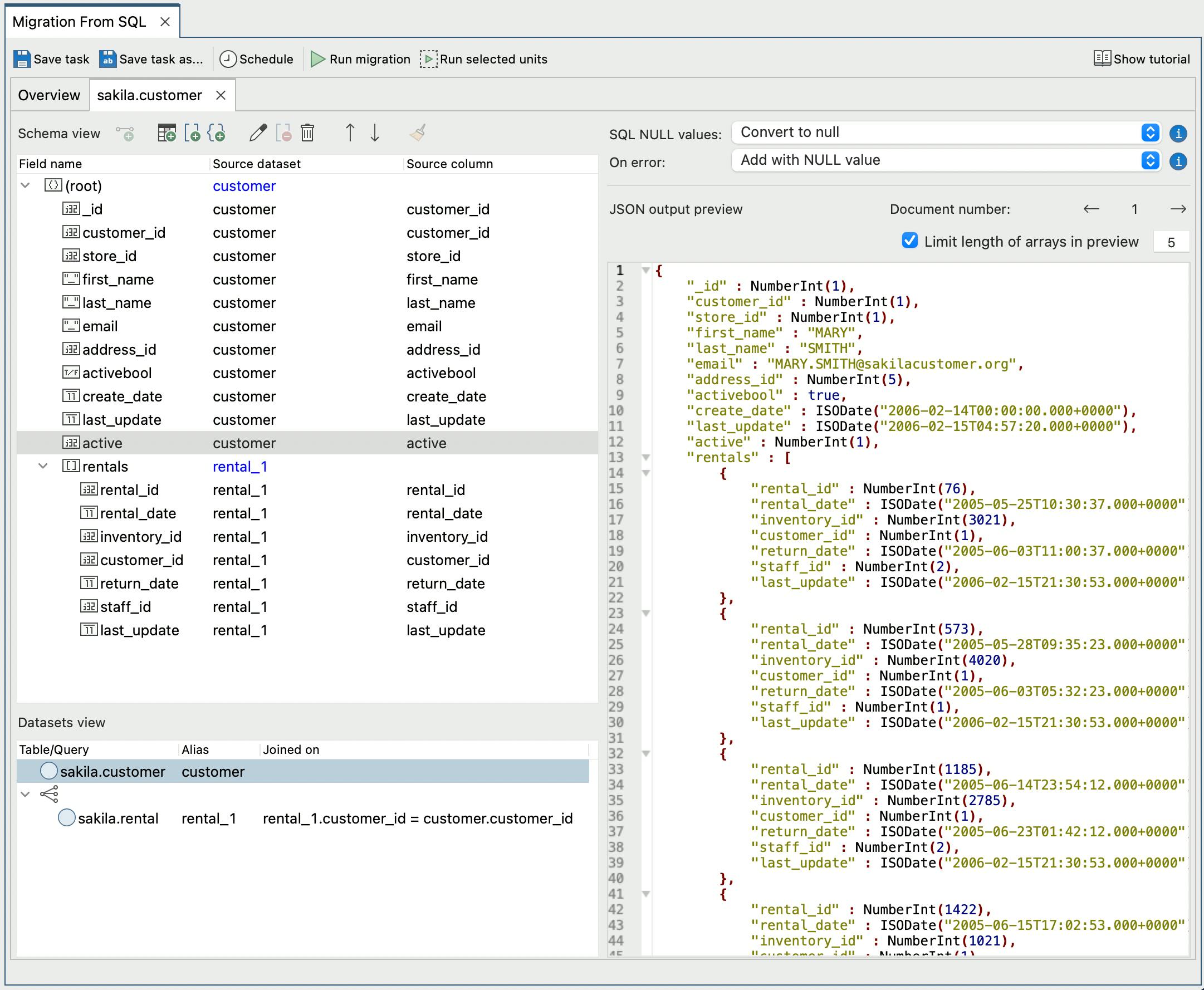 In Figure 1 (see above), we can see Studio 3T's SQL Migration pulling in multiple SQL tables, embedding rental records into the customer records, and previewing the JSON output.
