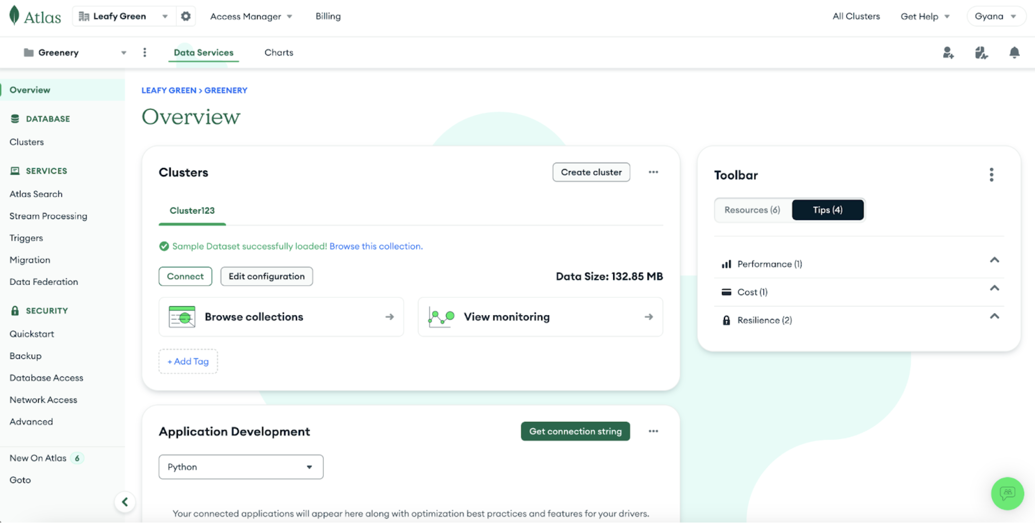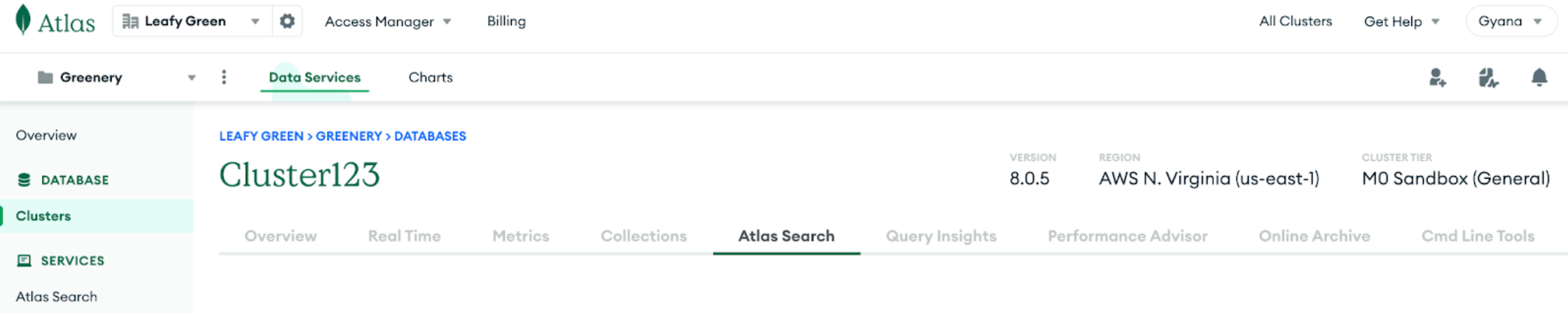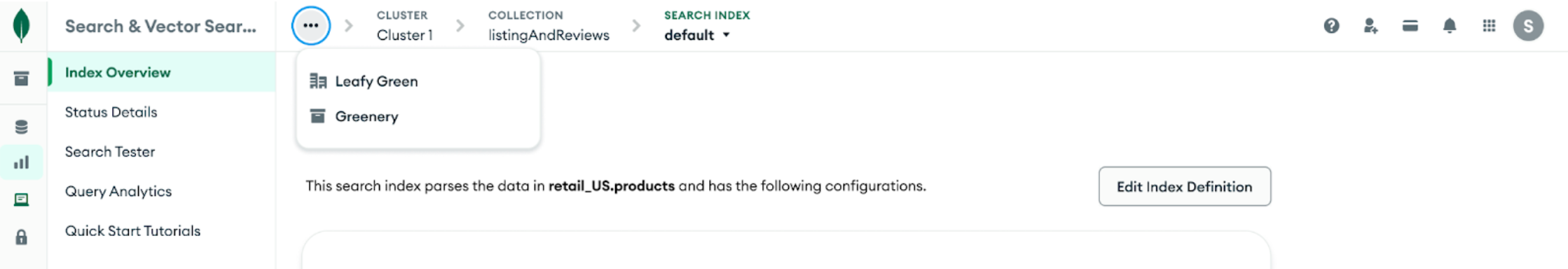 The updated top navigation bar, the resource navigator, always shows a developer which resource (e.g., project, organization, cluster) they are working on. Switching between resources is now simpler, with improved context clarity as users navigate deeper into Atlas. For example, switching between search indexes across different collections can now be done in a single click. The new workflow negates any need to backtrack to a project’s overview.