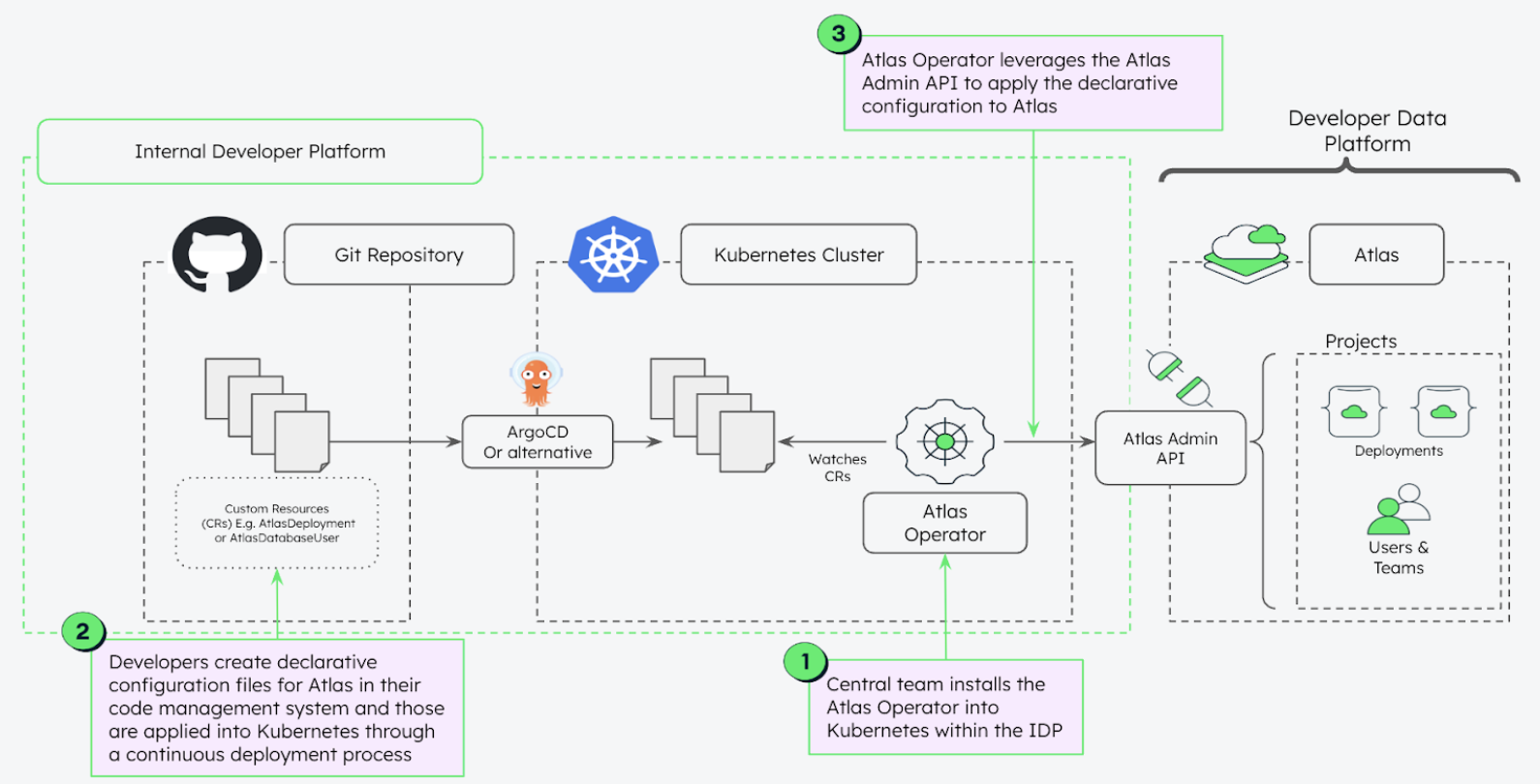 With the Atlas Kubernetes Operator, platform teams are able to seamlessly integrate MongoDB Atlas into the current Kubernetes deployment pipeline within their IDP allowing their developers to manage Atlas in the same way they manage their applications running in Kubernetes. First, configurations are stored and managed in a git repository and applied to Kubernetes via CD tools like ArgoCD or Flux. Then, Atlas Operator's custom resources are applied to Atlas using the Atlas Admin API and support all the building blocks you need, including projects, clusters, database users, IP access lists, private endpoints, backup, and more.