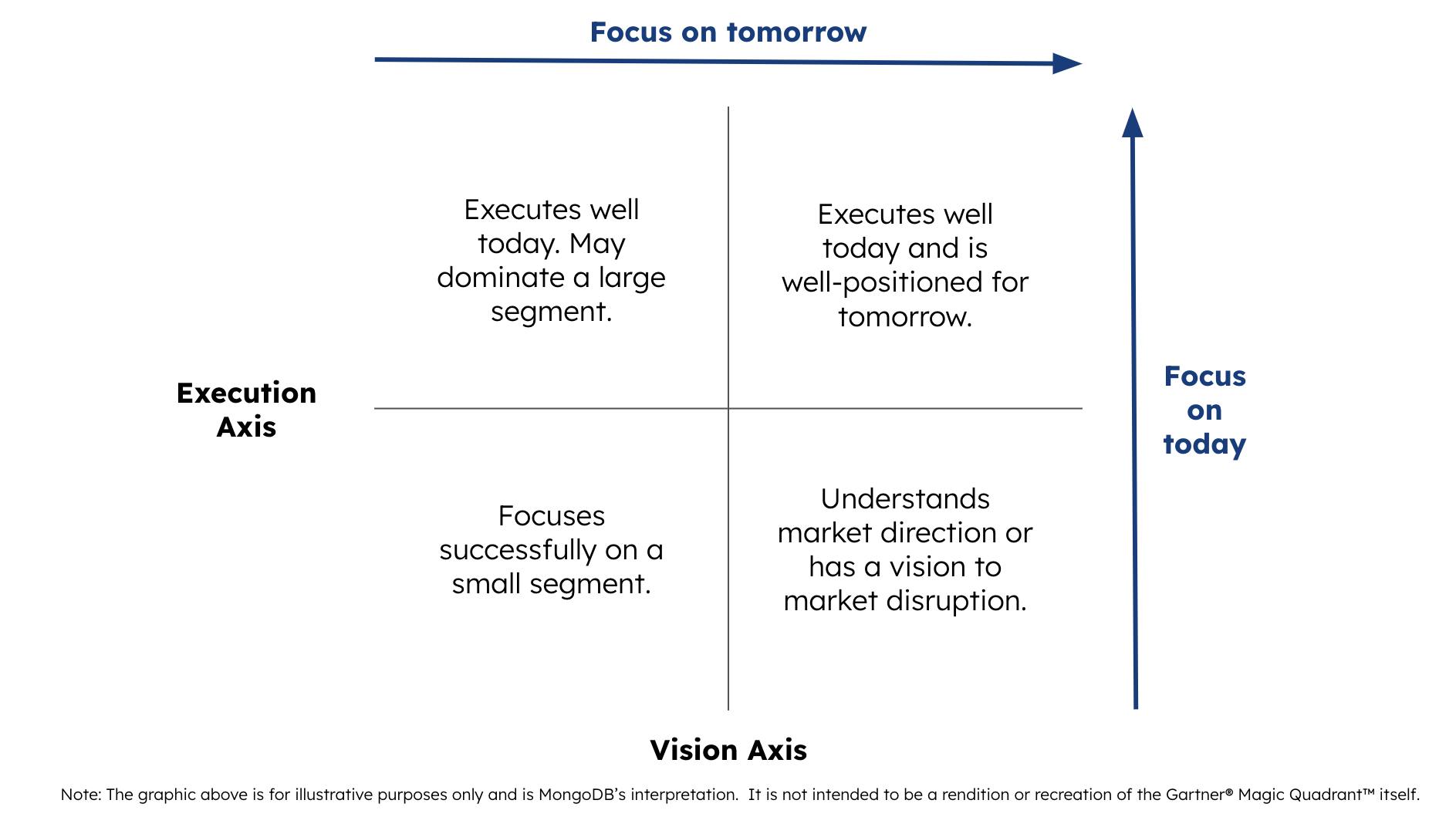 Here at MongoDB, we feel the true achievement is not in the placement, rather the means by which it was achieved. At MongoDB we strive to offer engineering teams an enhanced approach through a unified modern database as opposed to contending with multiple disparate and fragmented technologies and products. Our desire is to give customers a single cohesive design philosophy with a consistent workflow, API, data model, query language, management and navigation through this unified data developer platform. This design is flexible enough to service almost any application - so significantly reduces cognitive toil engineering teams have to deal with. Therefore, teams can build and release faster, evolving their apps at higher velocity than competitors. We believe that this philosophy has been validated, not only by the community of developers that have built up around MongoDB, but now by this placement in this publication from Gartner.