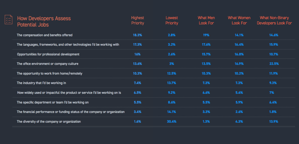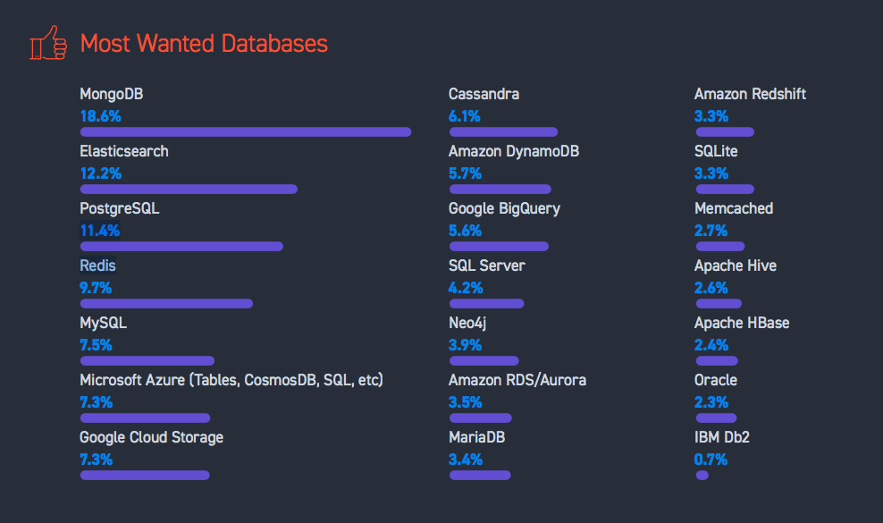 Hiring managers seeking talented developers may do well to review some of the additional statistics included in today’s release. One interesting statistic can be found in the chart entitled “How Developers Assess Potential Jobs”. If you are a hiring manager and you’re looking to attract top talent, considering the most wanted database platform might be a way to enhance the attractiveness of your opportunities.