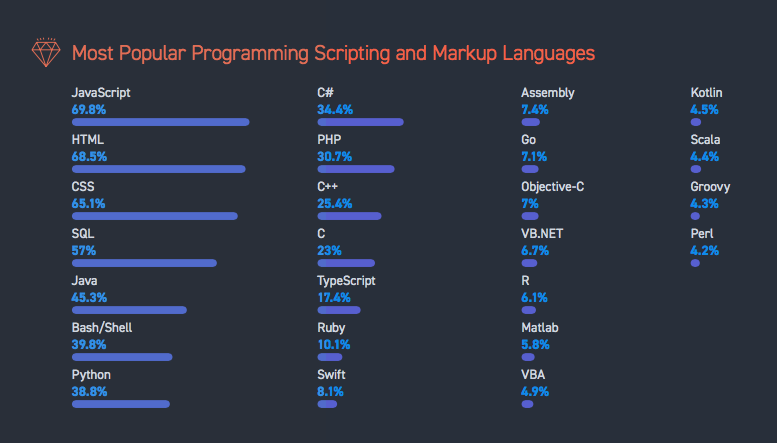 Javascript and Python developers reviewing the Stack Overflow report will be encouraged as these development environments continue to grow in popularity. Popularity of web application stacks like MEAN or MERN have provided Javascript developers with frameworks for building applications quickly.