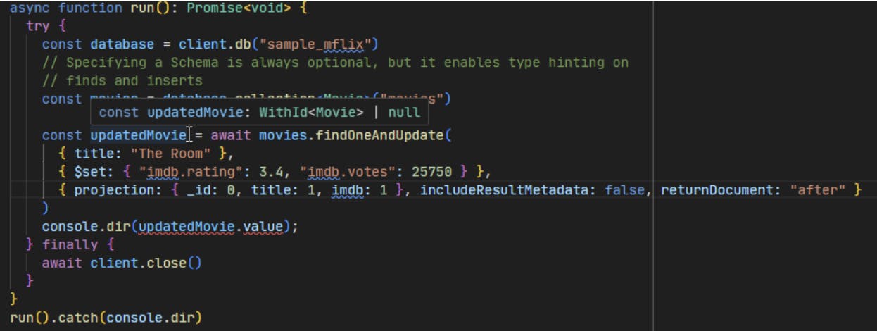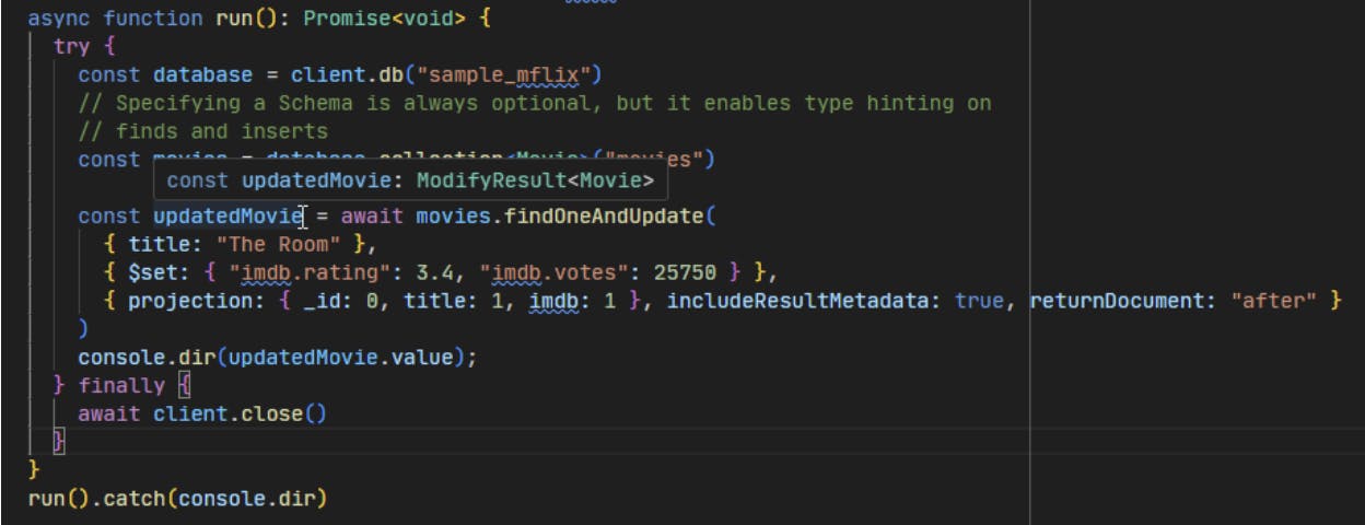 To demonstrate, let’s adapt the code from the Driver’s documented usage examples to update one document in our movies collection using the findOneAndUpdate API.