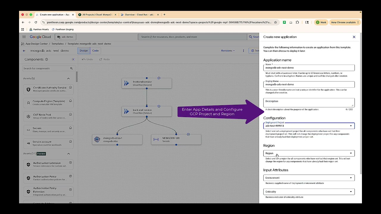 - Streamlined provisioning: With the integration, developers can drag and drop MongoDB Atlas components into their ADC design canvas. ADC then uses the MongoDB Terraform provider to automatically provision a new MongoDB Atlas cluster on Google Cloud, helping to ensure consistency and adherence to organizational standards.