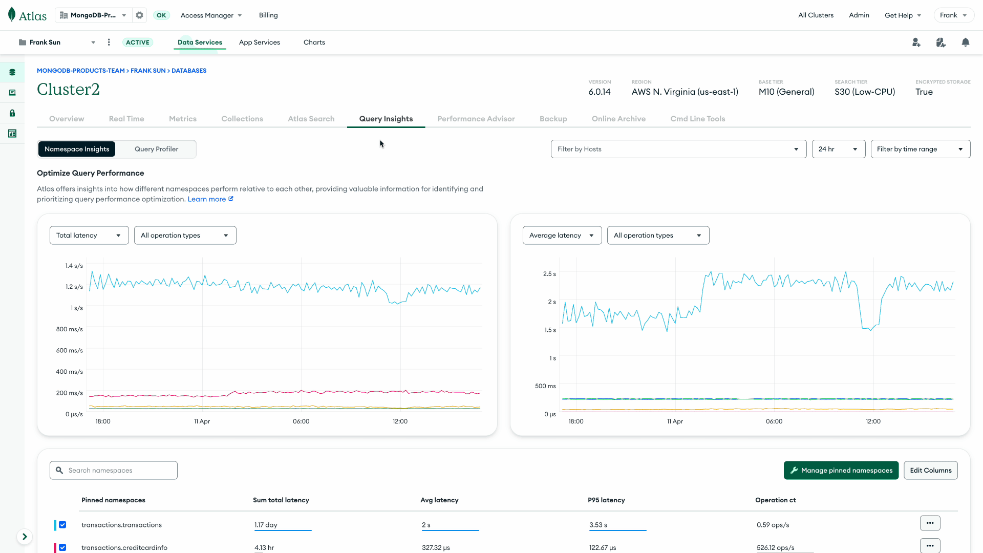 The newly added Namespace Insights provides users with collection-level latency statistics and a comprehensive view of how the hottest collections on a cluster perform over time. This enables developers to answer "Who or what is causing the problem?” which is instrumental in identifying performance trends and prioritizing query optimizations.