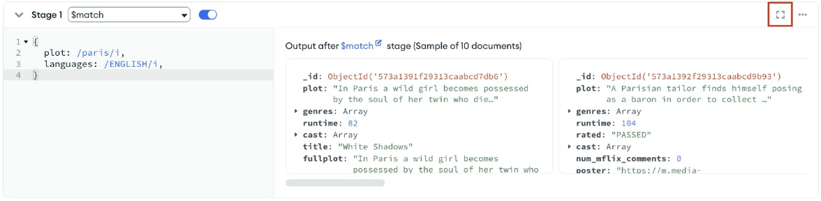 Now, developers can toggle Focus Mode on stages, opening a view that focuses exclusively on the contents of the specific stage they are working on. This view can also be used to view sample input (before the aggregation stage is applied) and output (after the stage is applied) documents, aiding in the understanding, troubleshooting, and optimizing of the data pipeline.