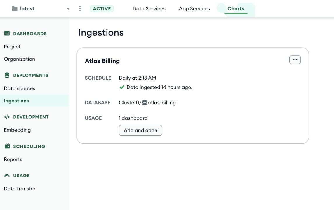 Enter the new billing dashboard. The new billing dashboard in Atlas Charts is as simple as a button click on our new Ingestions page.