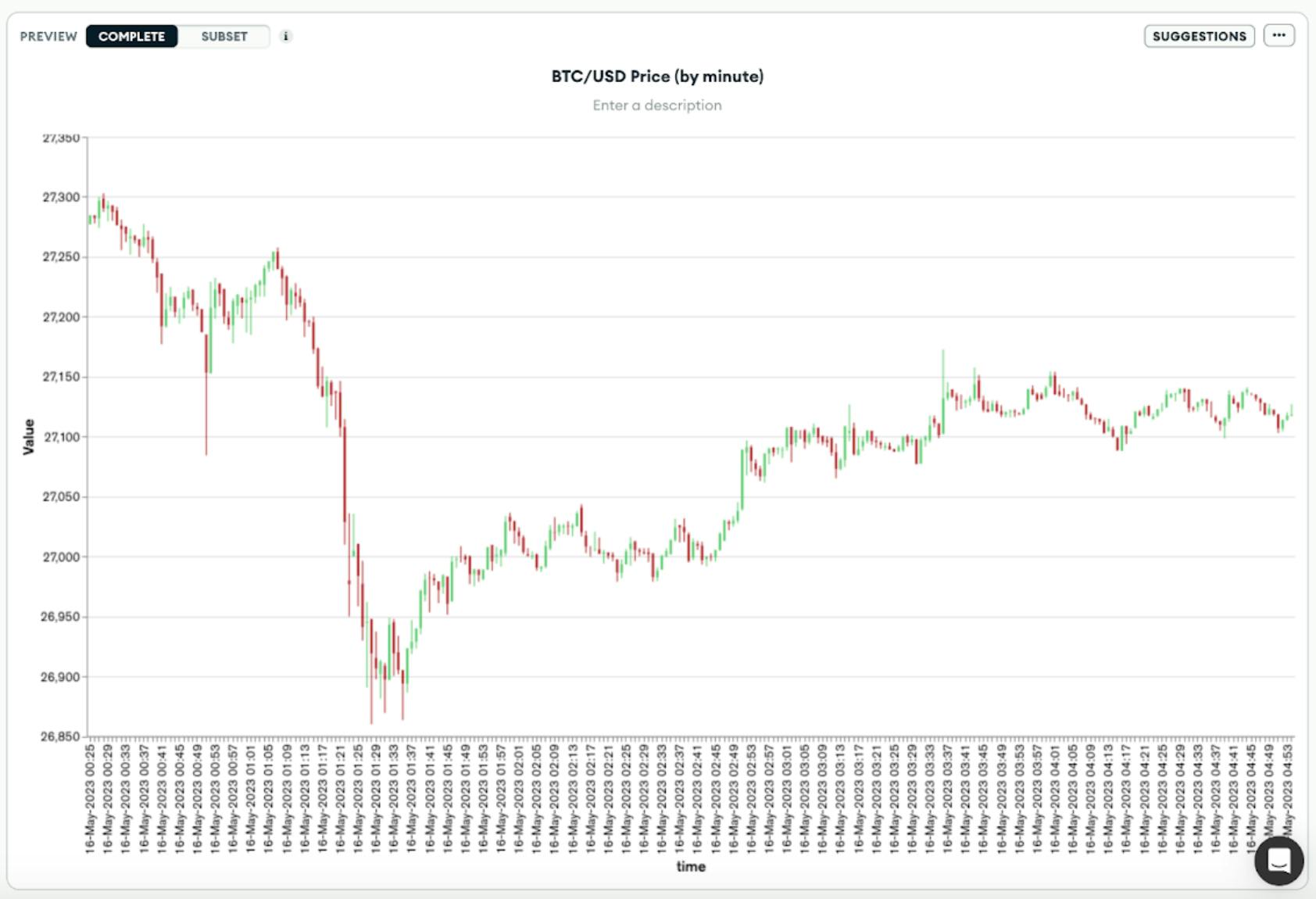 The third update in this release is support for candlestick charts. While many developers leverage the wide variety of chart types available in Charts, we are always paying attention to additional chart types that can enable even more use cases for visualizing your Atlas data. This is why we have added candlestick charts with this latest release. Candlestick charts are commonly used for financial data, richly representing financial trading trends and price fluctuations.