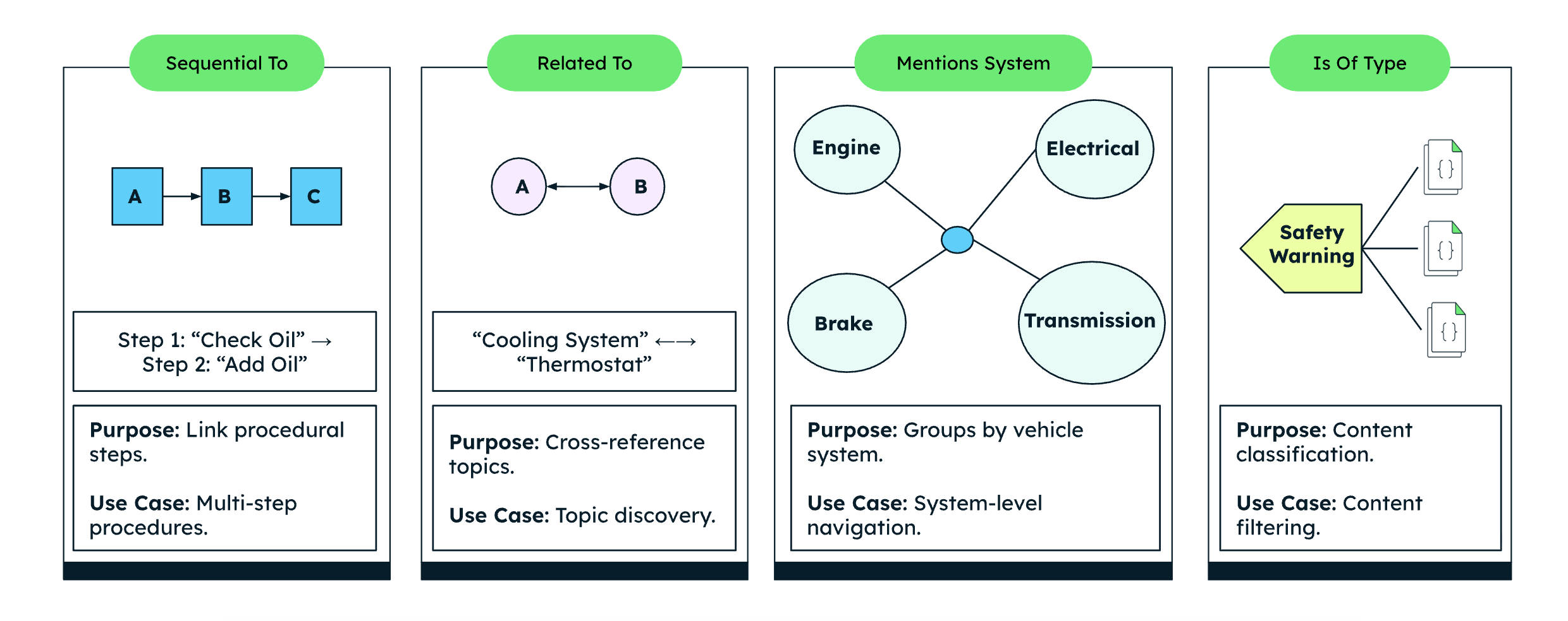 MongoDB’s flexible document model and the $graphLookup stage lets users store and traverse these relationships next to the source content. These relationships capture how vehicles actually behave, not how manuals are written. For example, relationships can be represented as:
