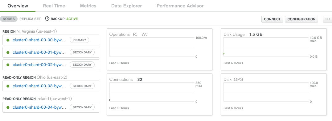 When the deployment of the cluster completes, we will be ready to distribute our application's data reads across multiple regions using the MongoDB drivers. We can specifically configure readPreference within our connection string to send clients to the "closest replicas". For example, the Node native MongoDB Driver permits us to specify our preference:
